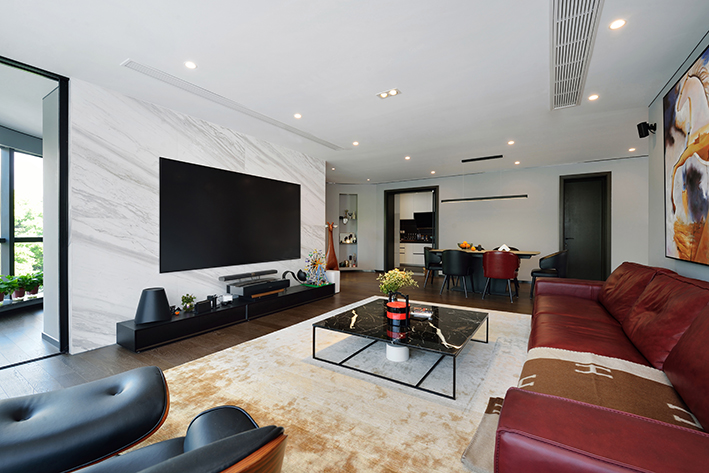 對(duì)于一些橫廳,或者開間很長的客廳,我們也可以選擇將書桌設(shè)計(jì)在沙發(fā)背后,即作為隔斷,也可作為書桌使用?,F(xiàn)在很多人家都喜歡用投影儀代替電視功能,那么電視背景墻也可用來設(shè)計(jì)書桌。